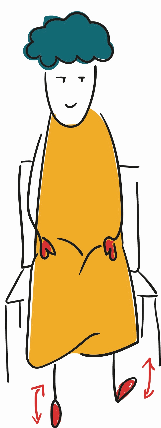 Auf einem Sessel sitzend abwechselnd die Füße auf die Fersen und auf die Zehen stellen. Zuerst beide Füße gleich, dann rechts und links abwechseln. Anschließend „Radfahren“.