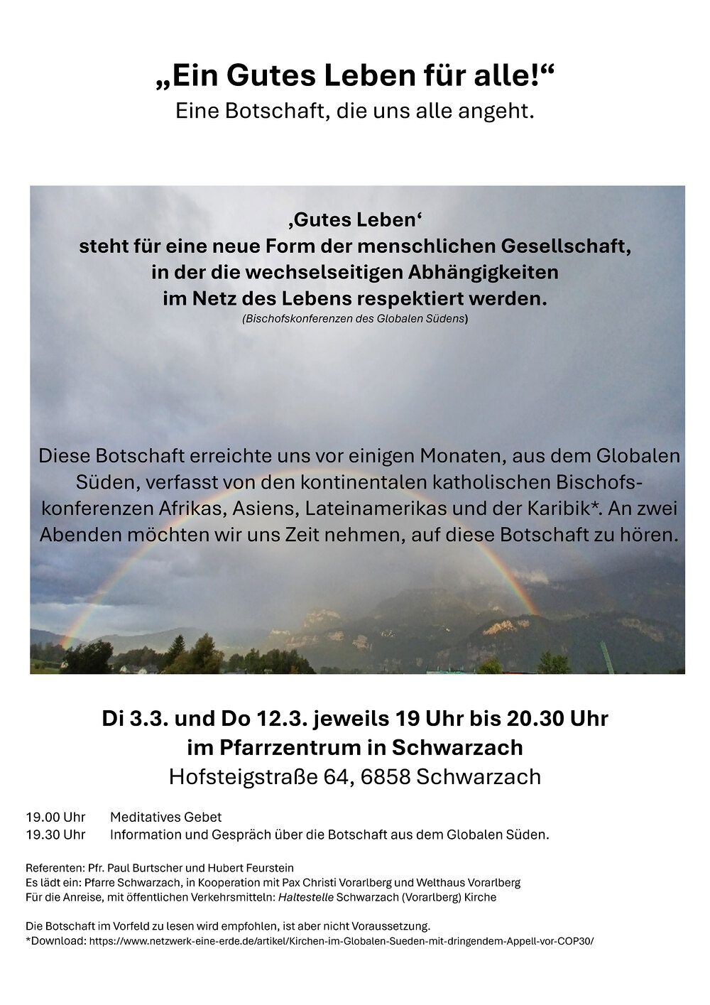 19.00 Uhr Meditatives Gebet 19.30 Uhr Information und Gespräch über die Botschaft aus dem Globalen Süden. Referenten: Pfr. Paul Burtscher und Hubert Feurstein Es lädt ein: Pfarre Schwarzach, in Kooperation mit Pax Christi Vorarlberg und Welthaus Vorarlberg Für die Anreise mit öffentlichen Verkehrsmitteln: Haltestelle Schwarzach (Vorarlberg) Kirche