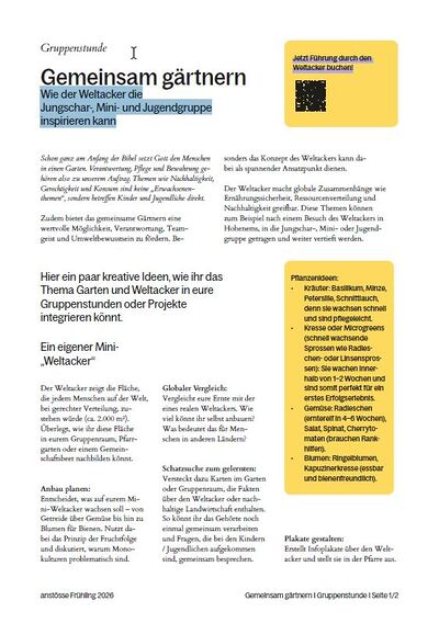 Schon ganz am Anfang der Bibel setzt Gott den Menschen in einen Garten. Verantwortung, Pflege und Bewahrung gehören also zu unserem Auftrag. Themen wie Nachhaltigkeit, Gerechtigkeit und Konsum sind keine „Erwachsenenthemen“, sondern betreffen Kinder und Jugendliche direkt.