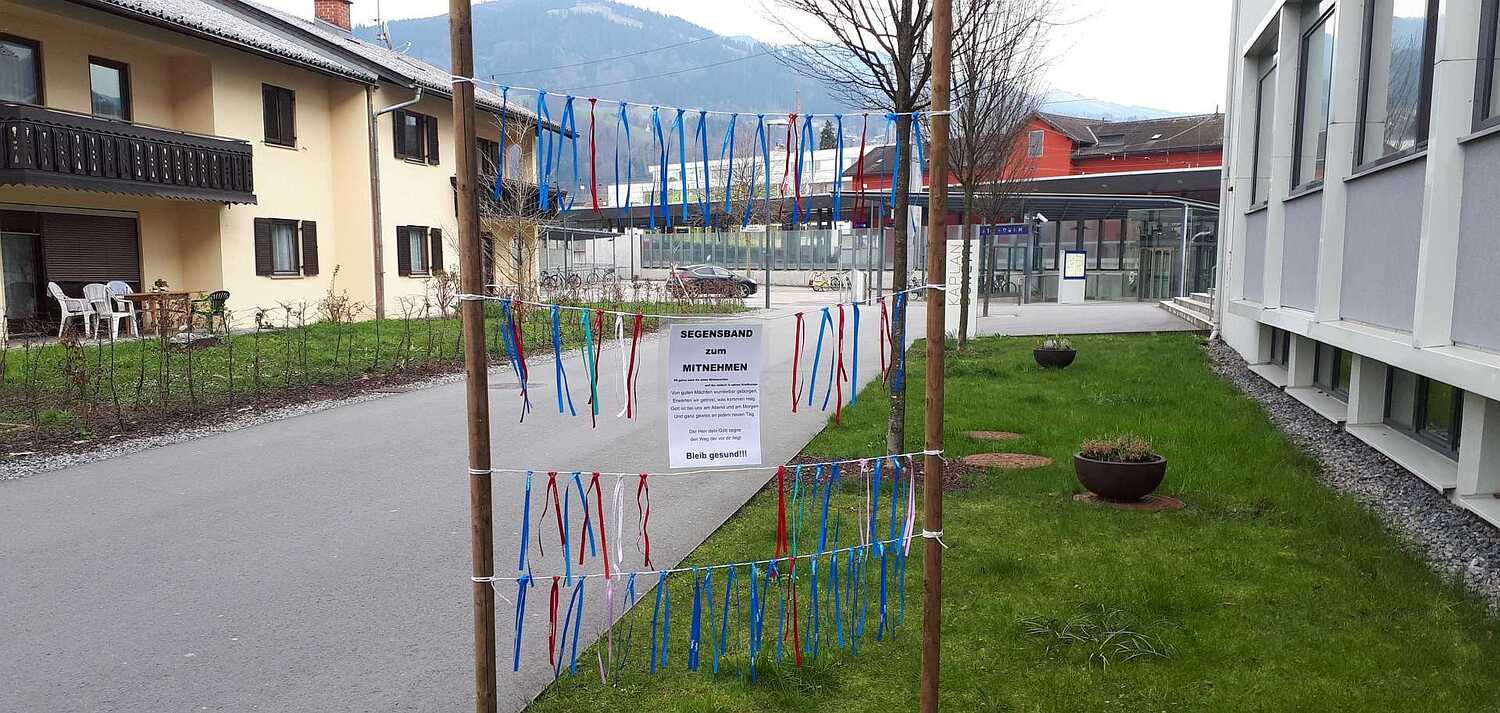 Quasi „im Vorbeigehen“ bei einem Spaziergang kann ein Segensband oder Segenskärtchen vom Ständer mitgenommen werden. Und zwar nicht nur für sich selbst, sondern auch gerne für Mitmenschen, denen man das Band in den Briefkasten werfen kann.