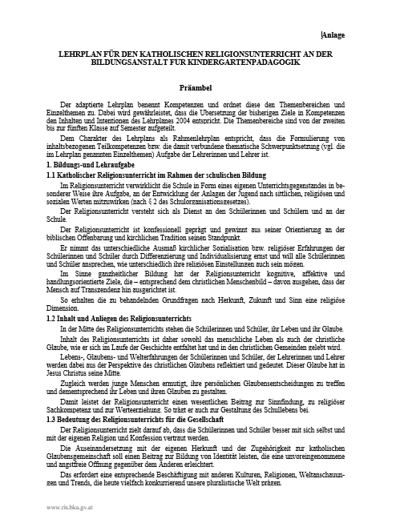 LEHRPLAN FÜR DEN KATHOLISCHEN RELIGIONSUNTERRICHT AN DER BILDUNGSANSTALT FÜR KINDERGARTENPÄDAGOGIK